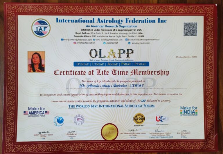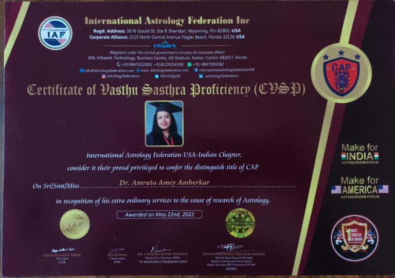A PhD Vastu Consultant and Honorary Doctorate in Numerology, she is also a Reiki Master and a Master in Tarot Card Practice. As a proud member of the International Astrology Federation, she has received multiple prestigious awards for her contributions to the field of metaphysical sciences.